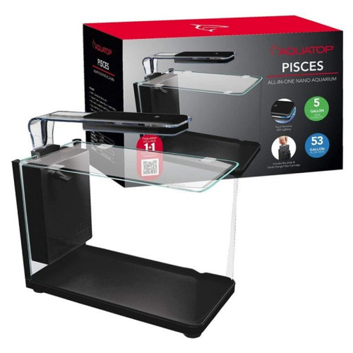 PISCES Modern Bullet-shaped Glass Aquarium, 5 Gallons Aquatops Pisces All-in-One Series of Nano Glass Aquariums offer a variety of sleek, modern designs. The PCS-5GB has a bullet-shaped glass design with seamless curved corners. Each unit includes an innovative and unique multi-stage internal filter box system which comes complete with a submersible pump and an easy-change drop-in filter cartridge filled with premium activated carbon. In addition to the Mechanical and Chemical filtration, the Pisces Nano Aquariums also includes a drop-in Bio-plate and ceramic rings for superb Biological Filtration. All models include a super bright touch-sensitive LED Light complete with a moonlight setting, and a tank lid with mounting clips. These space-saving desktop aquariums are perfect for fresh or saltwater set-ups.